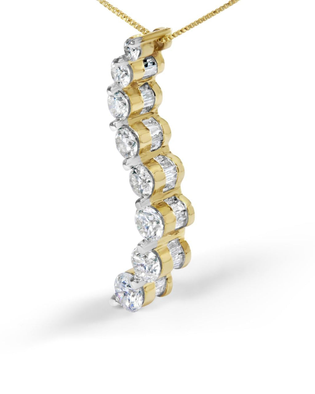 Eight stunning prong set round cut diamonds create a soft wave in this 14k yellow gold journey pendant. Baguette cut diamonds are set into the sides of the pendant giving it an unexpected design element that adds shimmer and elegance to this piece. The 3 carat TDW diamond pendant dangles from a box chain that secures with a spring ring clasp.