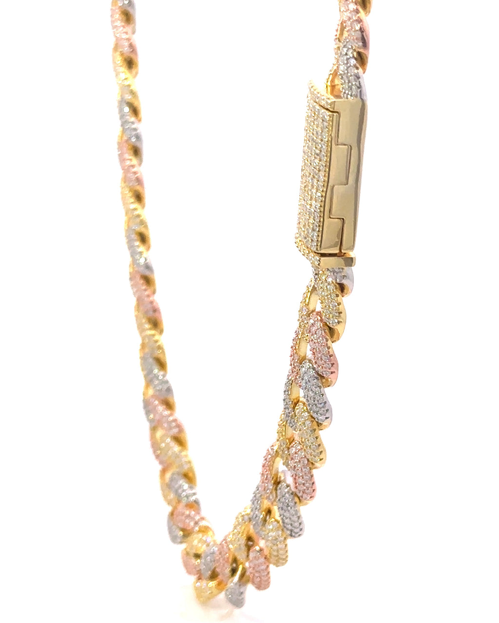 RILANE; This premium quality tri color cuban chain is trendy and long lasting. Adorned with white moissanite stones beautifully, this piece is sure to make a statement. Get your hands on it before it runs out of your access.